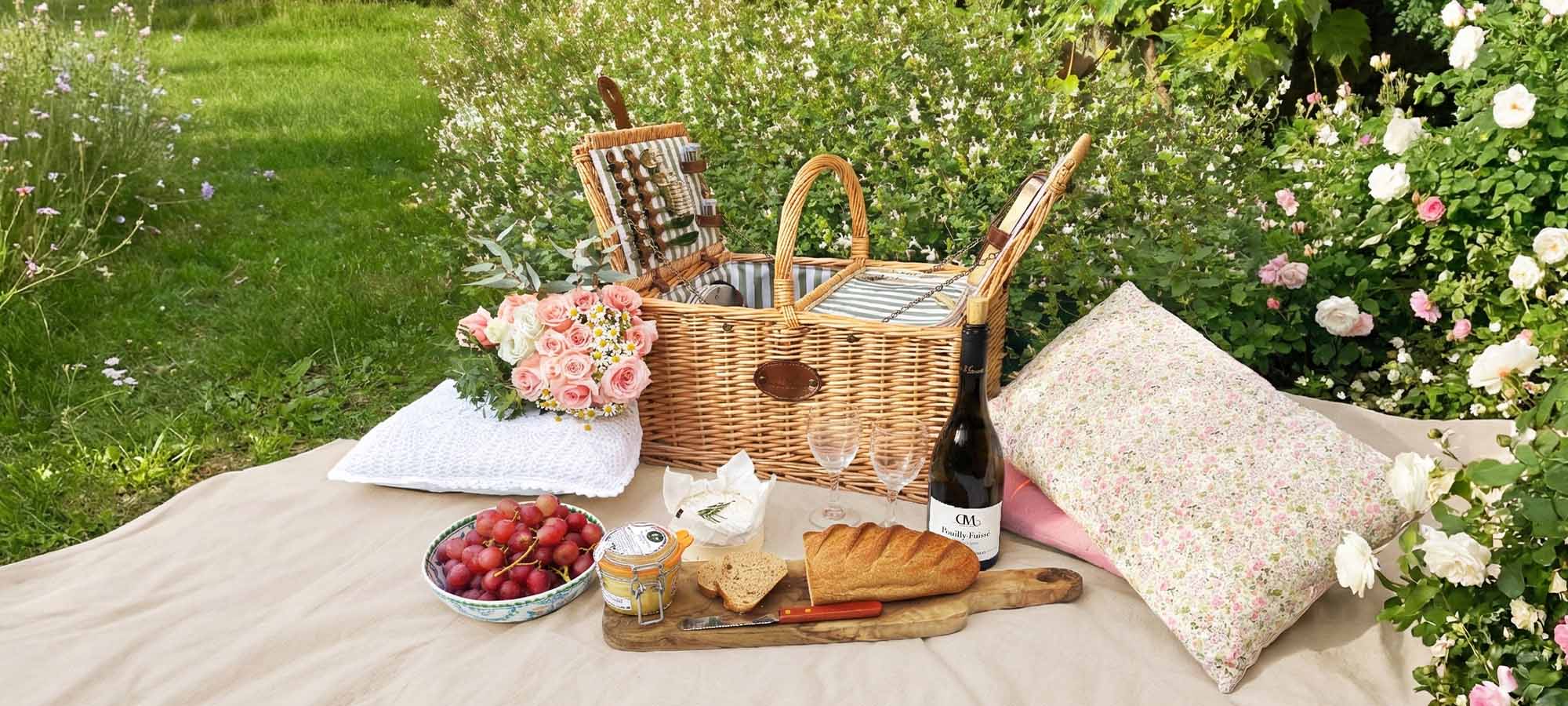 Natural wicker picnic baskets and backpacks sold with everything you need for a picnic (crockery, glasses, cutlery, etc.) for 2, 4 or 6 people. Most of our baskets have an insulated compartment.