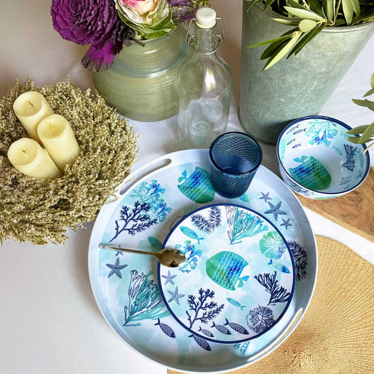 Let yourself be transported by our new "Caribbean" collection of melamine tableware, part of the MelARTmine Collection. Dive into the heart of the Caribbean Sea with this new collection of melamine tableware. Its shades of blue, its marine flora and fauna motifs and its modern, elegant design will take you on a voyage of discovery.