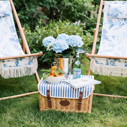 ● A picnic basket with a matching tablecloth: The Marine model is a particularly chic 4-person picnic basket with its blue straps and naturally white-patinated wicker. This basket comes with a tablecloth of matching fabric in an ideal format for 4 people and more.