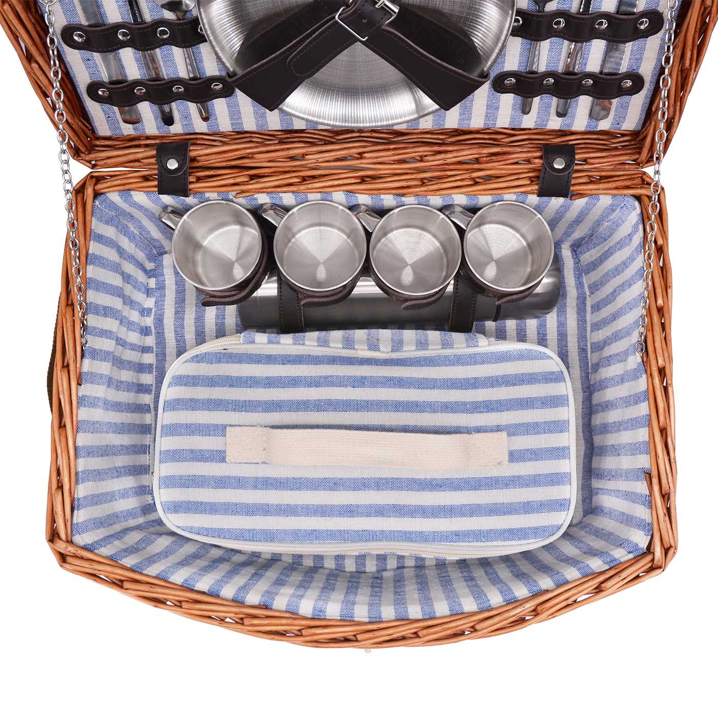 To design the Rochefort basket, we thought of "practicality" and "novelty"! The novelty? All the accessories of this basket: plates, mugs, cutlery, thermos, corkscrew, and salt-pepper set are made of stainless steel. Easy to use, easy to clean, and unbreakable, making it an ideal basket for picnics with friends.