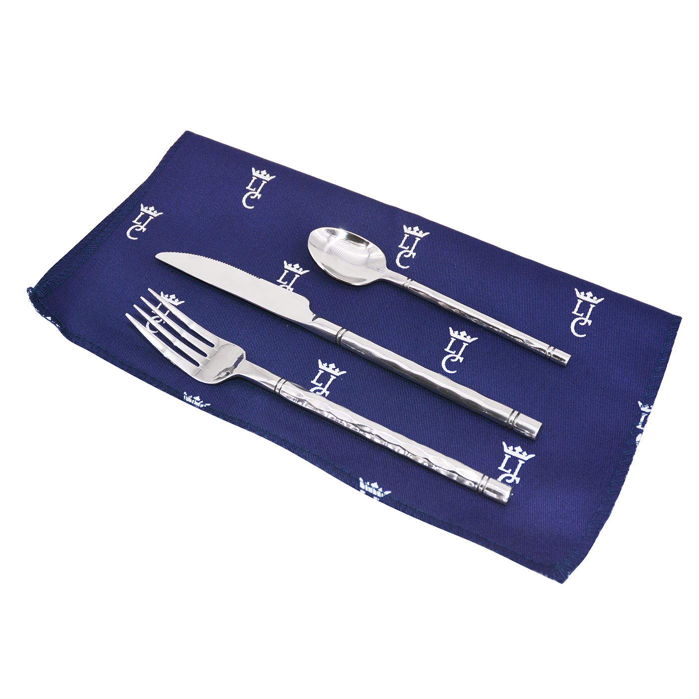 - 6 complete cutlery sets in 18/0 stainless steel, with 6 knives, 6 forks, and 6 teaspoons held by stitched leather straps,