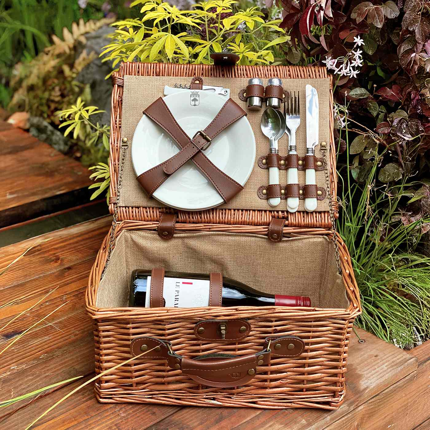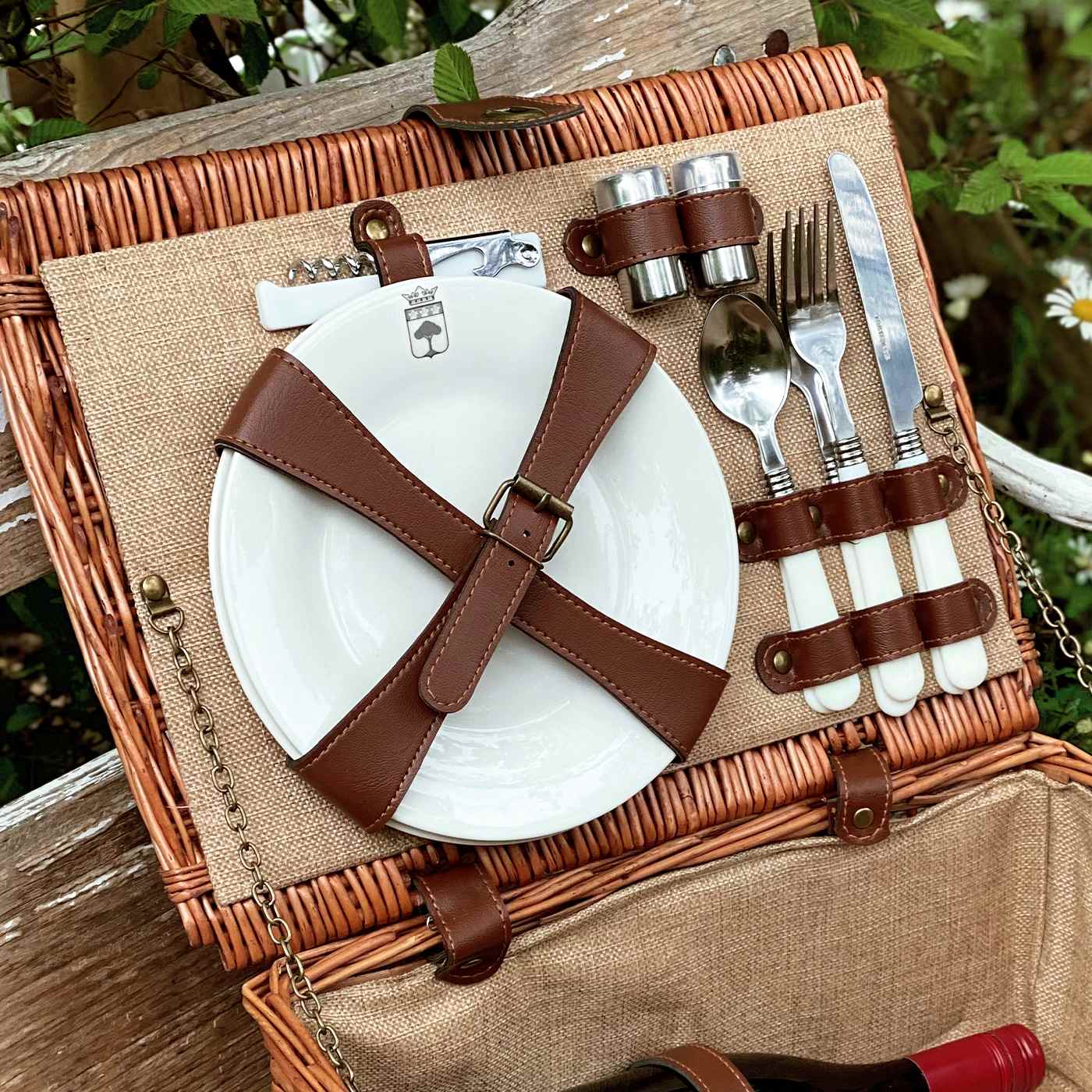 A wicker basket with a jute fabric interior for a picnic for two. It’s compact but complete, and you can easily put it on the luggage rack of your bike or classic car!!